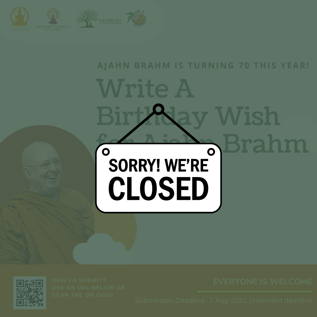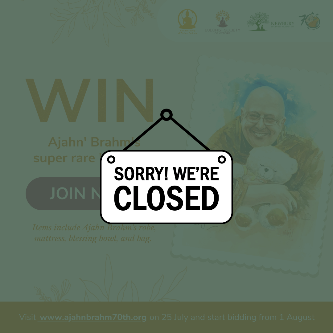 Join this online event which starts from the Newbury Buddhist Monastery in Victoria and then moves to Jhana Grove in Western Australia where Ajahn Brahm will be celebrating his birthday in person!