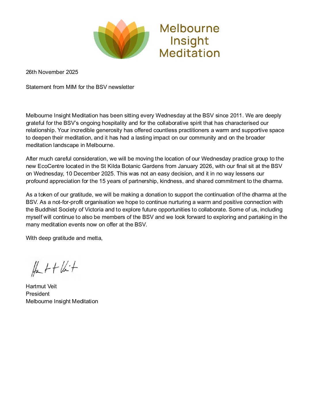Melbourne Insight Meditation (MIM) has met weekly at the BSV since 2011 and will move to the EcoCentre in St Kilda Botanic Gardens from January 2026. Below is letter from MIM’s President in appreciation of the support provided by the BSV over many years.